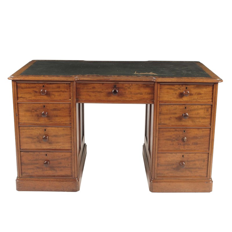 A 19th century mahogany pedestal desk, the moulded edge double inverted fixed top inset replaced cloth, above a central frieze drawer and four drawers to each pedestal, panelled sides and cupboards to the reverse each enclosing a shelf, on wooden castors, 30.25in (77cm) h, 52in (132cm) w, 30in (76cm) d.
