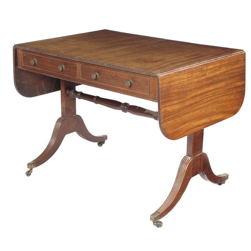 An early 19th century mahogany sofa table, with a reeded edge twin flap top, above two frieze drawers with replaced brass knob handles, on trestle end supports united by a turned stretcher on ribbed scroll legs with brass castors, 28.25in (72cm) h, 37.75in (96cm) w, 26in (66cm) d.