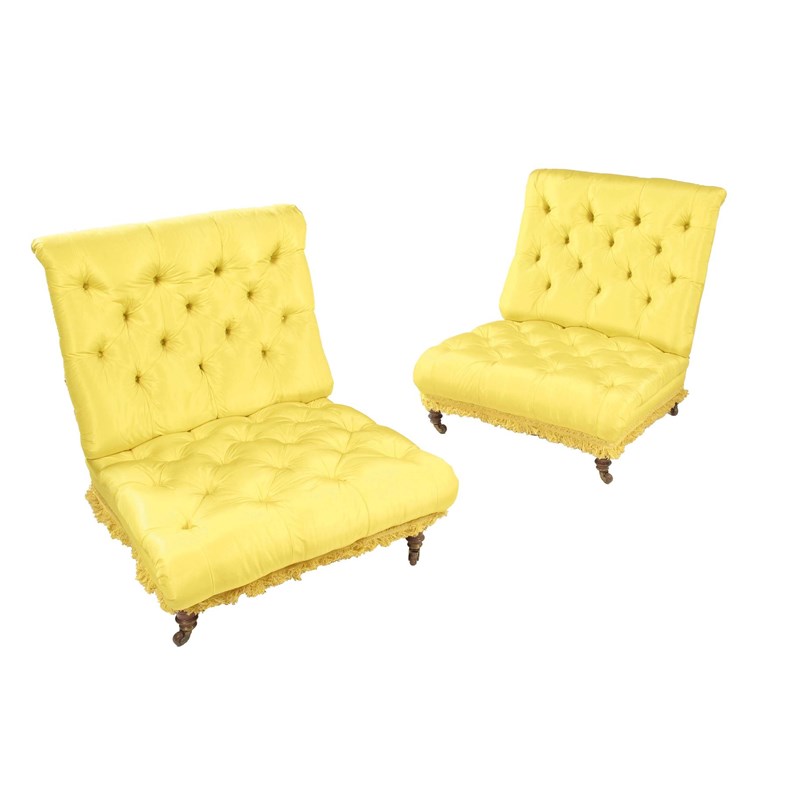 A pair of Victorian walnut button upholstered low chairs