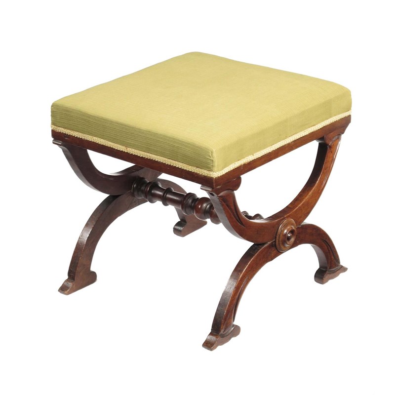A 19th century mahogany 'X' frame stool, the stuffed-over seat above moulded and rondel capped supports united by a turned stretcher, 16.25in (41.3cm) h, 17.25in (43.7cm) w, 16.5in (42cm) d. Old worm holes and repairs.