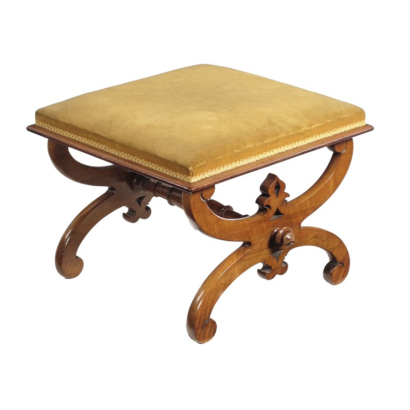 A Victorian walnut 'X' frame stool, the padded seat to pierced scroll supports united by a turned stretcher, 16.25in (41.2cm) h, 21.5in (54.5cm) w and d.