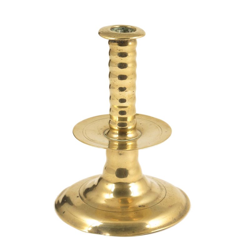 A Charles II brass 'trumpet' candlestick, the ribbed stem to a central drip tray and to a domed foot, the underside engraved with initials 'T' over 'A M', 6in (15.2cm) h, 4.5in (11.1cm) dia. Some dents and a repair to the stem.