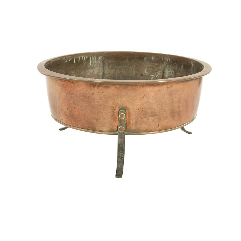 A copper circular jardiniere, with applied brass scroll legs, 10.5in (26.5cm) h, 27.5in (53cm) dia.