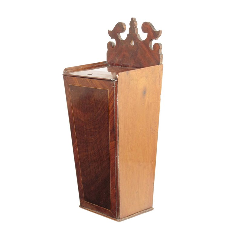 A George III mahogany candle box, inlaid stringing, the fret carved surmount to a slide-off cover, 18in (45.6cm) h, 7.25in (18.3cm) w. Some repairs.