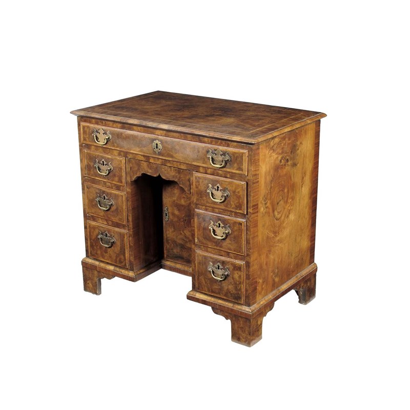 A burr walnut kneehole desk, in George II style, with chevron banding, the quarter veneered top with a moulded edge above a frieze drawer and three drawers each side, flanking and shallow drawer and a cupboard door, on bracket feet, 28.25in (72cm) h, 31in (79cm) w, 19.25in (49cm) d.