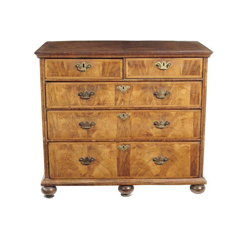 A George II walnut chest, with feather banding, the quarter veneered top above a moulded edge and two short and three long graduated drawers fitted later brass plate handles and escutcheons and later bun feet, 34.75in (88cm) h, 39in (99cm) w, 22in (56cm) d.