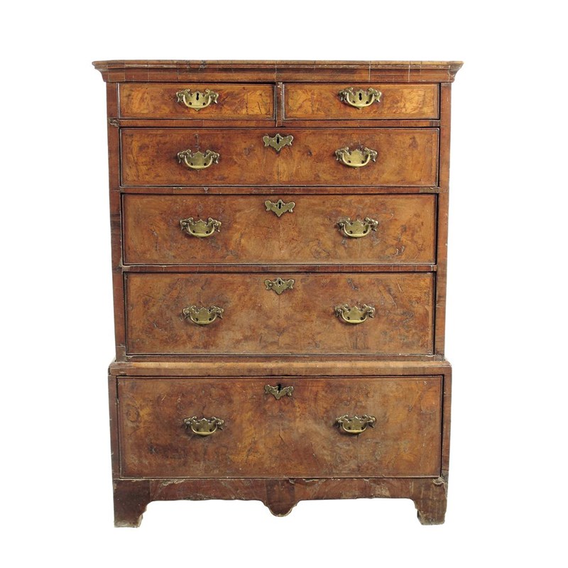 A George II walnut chest on stand, the moulded cornice above two short and three long graduated drawers, the base with a deep drawer all feather banded and with replaced handles, the shaped apron to bracket feet, previously on bun feet, 52in (132cm) h, 39.5in (105.cm) w, 21.25in (54cm) d.