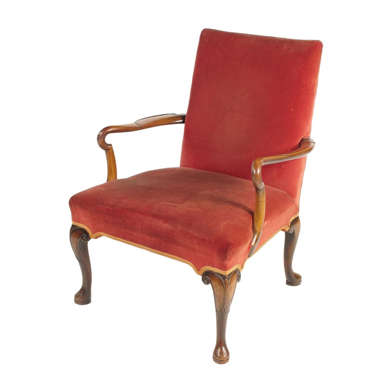 A walnut open armchair in early 18th century style, the padded back and seat to shepherd's crook arms on shell capped cabriole legs and pad feet, late 19th century.