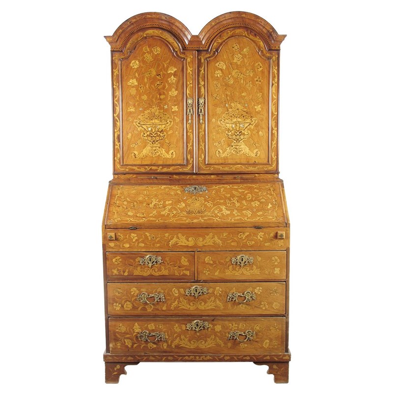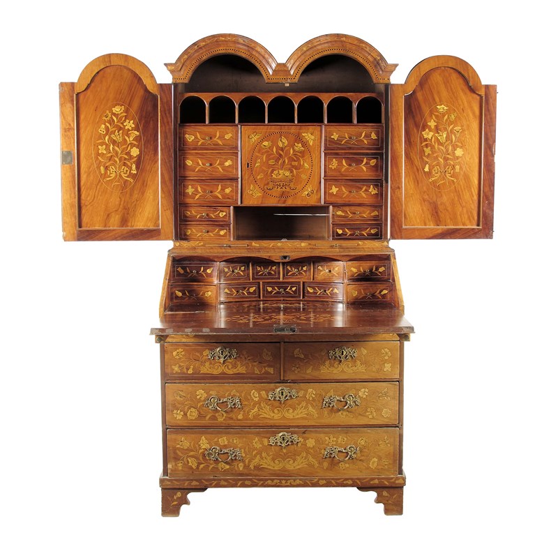 A Dutch walnut and floral marquetry bureau cabinet, the double domed top above a pair of arch doors inlaid a vase of flowers, with a bird, insects and mother of pearl highlights, enclosing pigeon holes, drawers and a central cupboard, above a pair of candle slides, the fall revealing a concave interior with drawers above a well cover, above two short and two long drawers with bracket feet, 80in (203cm) h, 40in (101.5cm) w, 23in (58.5cm) d.