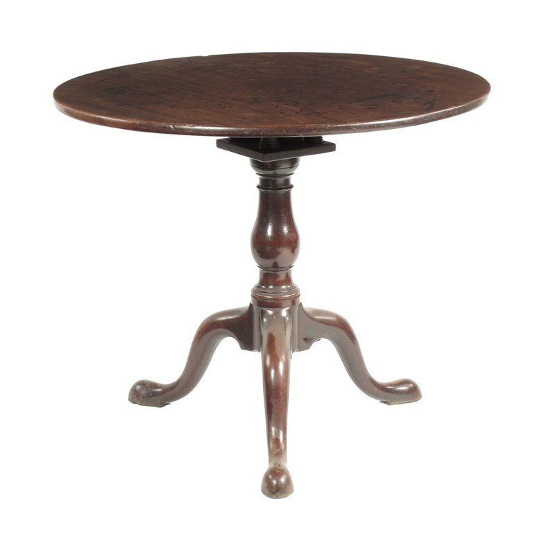 An early George III mahogany tripod table, the circular tilt- top revolving on a birdcage, on a baluster stem and cabriole legs and raised on pad feet, 28.25in (72cm) h, 33.75in (85.5cm) dia.