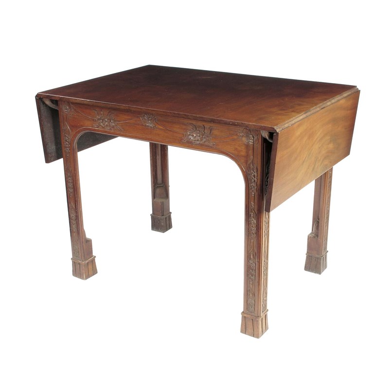 A carved mahogany serving table, with a drop-leaf top above a ribbon and floret carved frieze and legs to guttae block feet, 20th century, 33in (84cm) h, 64.5in (164cm) w, open, 30in (76cm) d.