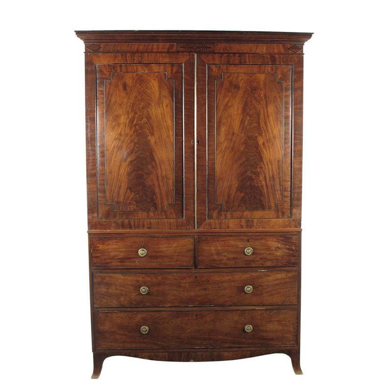 A Regency mahogany linen press, with ebonised mouldings, the detachable cornice decorated with palmettes above a pair of panelled doors enclosing five slides, the base fitted two short and two long drawers on swept bracket feet, 84in (213.4cm) h, 56in (142.5cm) w, 22.25in (56.6cm) d.