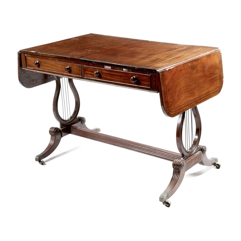 A George IV mahogany sofa table, inlaid with stringing, the drop-leaf top above a pair of frieze drawers with faux fronts to the reverse, on lyre ends and reeded legs united by a low stretcher, with brass caps and castors, 74.9cm high, 147.8cm wide, 66.5cm deep (open).