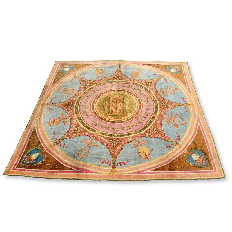 A 19th century French Savonnerie Empire style carpet, with a central fan medallion decorated with laurel leaves and with a classical twin griffin flaming athenienne with an outer border of swags of flowers hung with eight musical instruments including lyres and a horn, with classical mask spandrels with palmette decorated headdresses, 490 x 439cm.