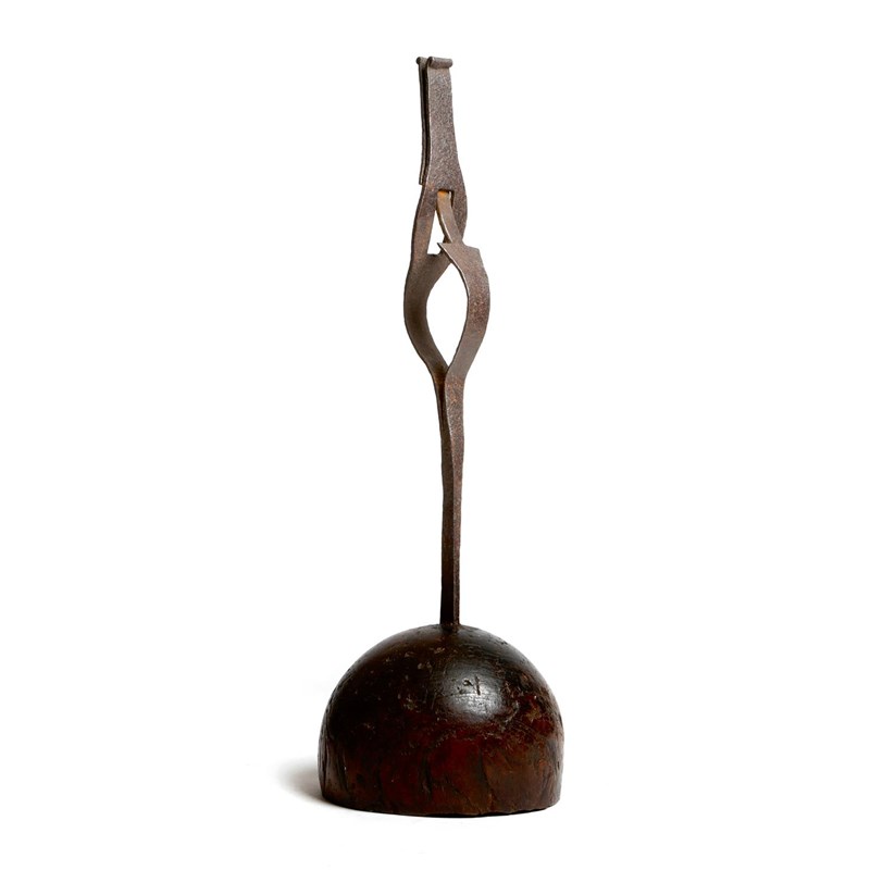 A large early 19th century wrought iron table peerman, on a wooden base, 44.8cm high.