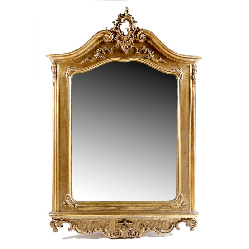 A Louis XV style giltwood wall mirror, the shaped plate within a moulded frame decorated with scrolls, leaves and rocaille, 154 x 107.1cm.