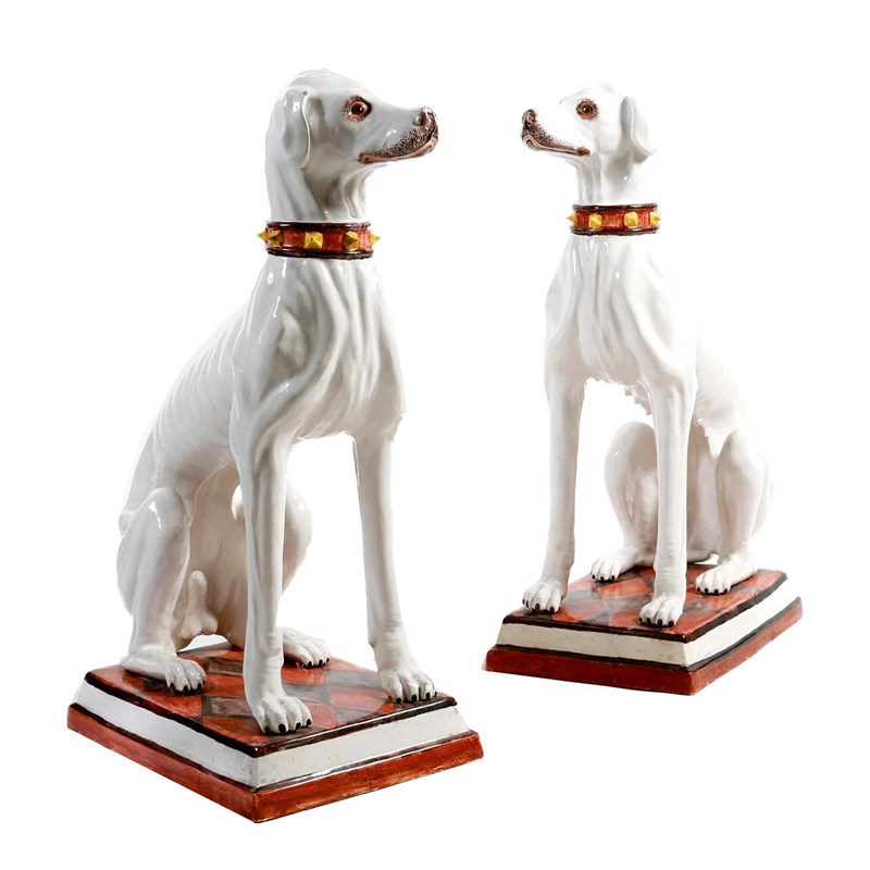 A large pair of faïence pottery models of seated dogs, each with a studded collar, raised on a plinth base, 99.8cm high, 71cm long. (2)