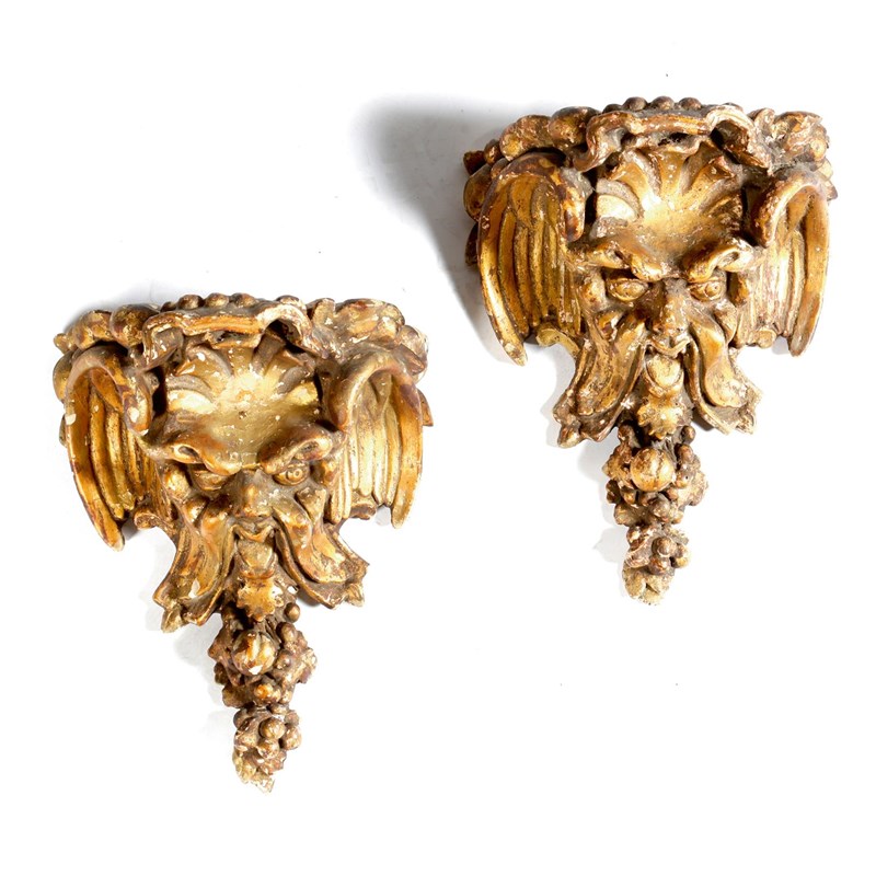 A pair of 19th century giltwood and gesso corbels, each modelled in the form of a grotesque head with a shell surmount and a fruit pendant, 40.5cm high, 30cm wide.