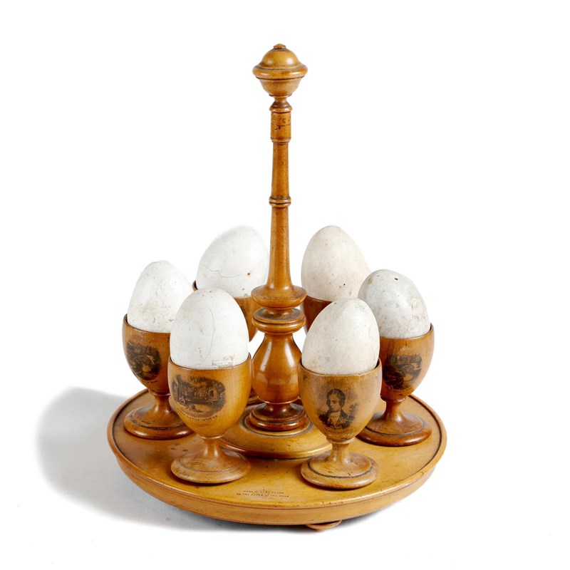 A Victorian Scottish Mauchline ware egg cruet, with six cups each decorated with transfer printed scenes and faux eggs, the base inscribed 'MADE OF WOOD GROWN ON THE DOOR OF THE DOON', 26.7cm high, 20.4cm diameter.