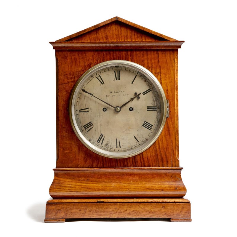 A Victorian oak mantel clock, the eight day twin train movement striking on a gong, with a silvered dial, with Roman numerals and a 'Silent Strike' switch and inscribed 'BISHOPP, 20, BUNHILL ROW', in an architectural case with fishscale panelled sides, 46cm high, 32.7cm wide.