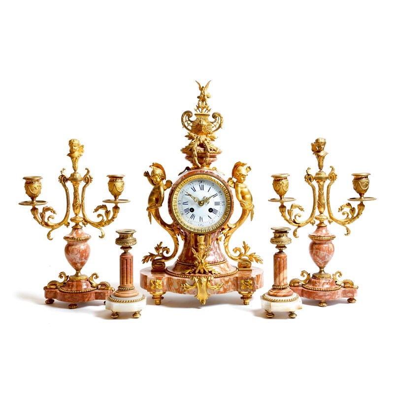A French pink breccia marble and ormolu mounted clock garniture in Louis XVI style, the eight day brass drum movement, with an outside countwheel, stamped 'H & K, PARIS 1996' and '83', with a white enamel dial with Roman and Arabic numerals, the case decorated with Mercury style cherubs, with a laurel wreath and war trophies, with a pair of matching twin-light candelabra and a pair of associated candlesticks, late 19th century, 45.5cm high. (5)