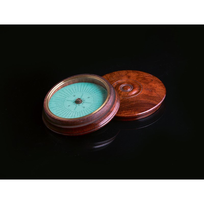 Great Exhibition interest. A rare Victorian mahogany pocket compass, the screw-off lid revealing a green card dial with various London landmarks emanating from Regent Circus with distance in miles, including: 'The Exhibition', 'African Exhibition', 'Egyptian Hall', the base with a cardboard insert inscribed in pen 'COMPASS MADE FOR VISITORS TO THE EXHIBITION IN HYDE PARK 1851', 8.2cm diameter.