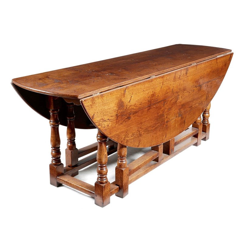 A large 17th century style oak gateleg dining table, the oval drop-leaf top on baluster turned legs united by peripheral stretchers, with twin gate supports, 20th century, 75.7cm high, 198 x 153cm (open).