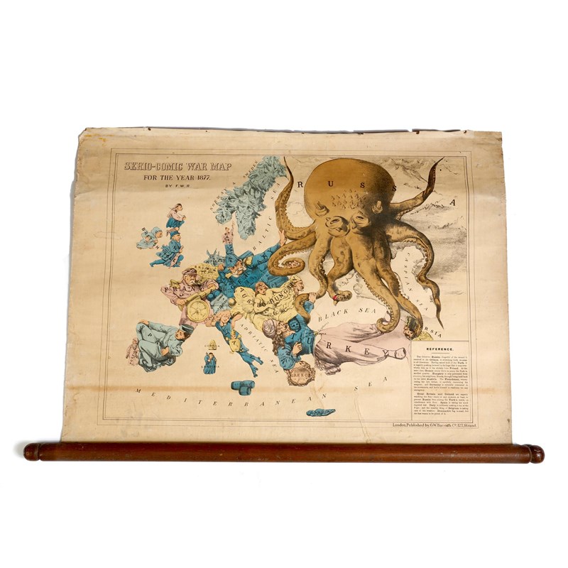 This rare anthropomorphic map was designed by Fred Rose and is a satirical commentary on the 'Eastern Question' and the geo-political situation of 1877. It depicts a fanciful map of Europe with each country represented by an appropriate figure. The main protagonist is Russia in the form of a giant octopus with its tentacles outstretched symbolising threat and advances to the Ottoman Empire. The Turkish figure aims a pistol at the octopus however one can see a skull inscribed 'Bulgaria' on the shoulder of the Turkish figure which symbolises the bloody war crimes the Bulgarians suffered at the hand of the Turks. Britain in the form of Gladstone is a keen but distant observer, Germany is a neutral observer, whilst Austria holds back its new ally Hungary from joining the conflict.