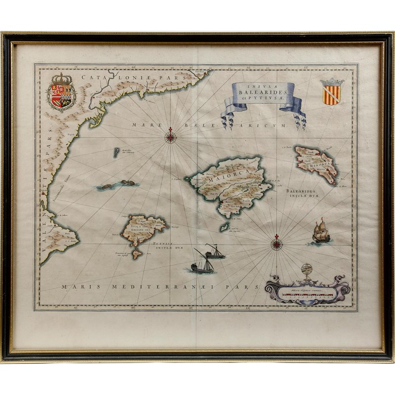 Joan Blaeu (Netherlands 1596 - 1673). A 17th century hand-coloured engraved map, of the Balearic Islands, inscribed 'INSULAE BALEARIDES et PYTIUSAE', 50 x 38.2cm, in a later glazed frame.