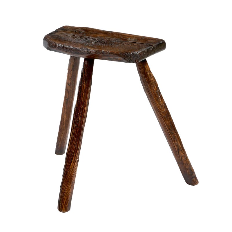 A primitive elm dairy stool, the underside of the seat branded with initials 'NB', on tripod supports, 53.4cm high, 59.7cm wide.