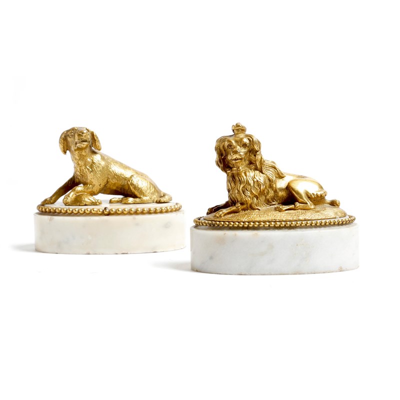 Two French gilt bronze models of recumbent dogs, one of a poodle the other of a spaniel, with beaded borders and on a marble oval plinth, late 18th / early 19th century, 10cm wide. (2)