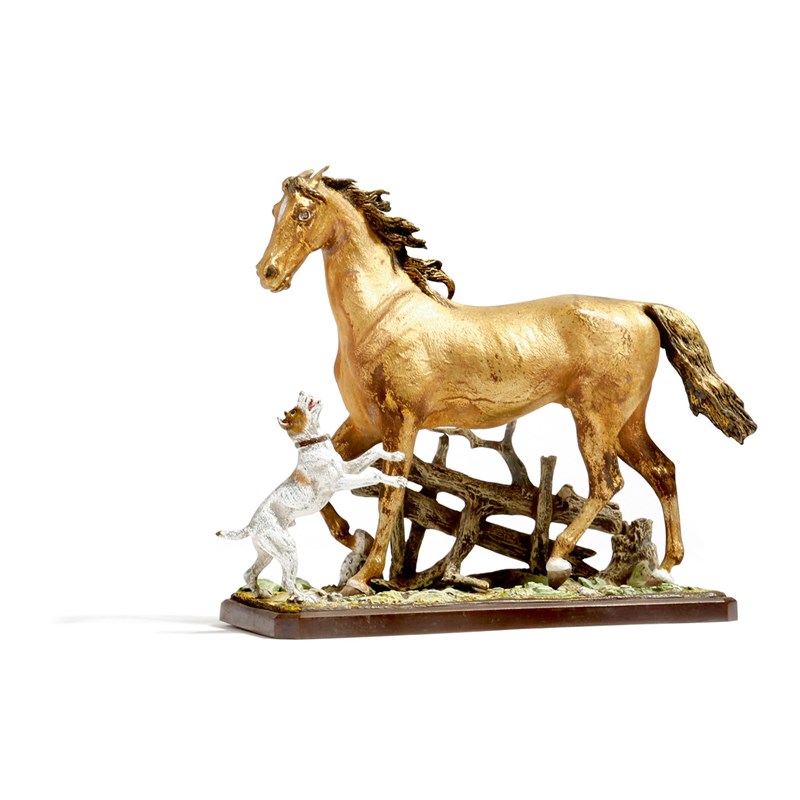 A cold painted bronze group of horse and a dog