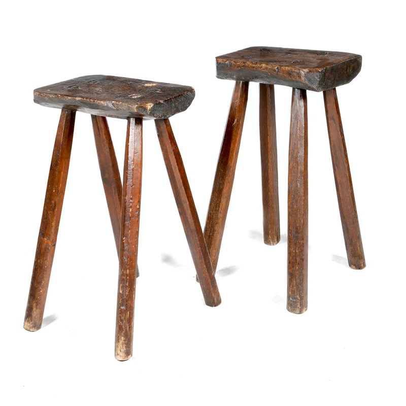 Two 19th century oak and elm primitive dairy stools, each on chamfered supports, 60.2cm high, 33.5cm wide, 36.5cm deep (max). (2)