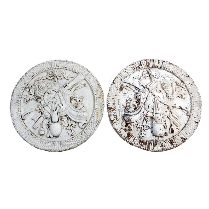 A pair of carved and painted wood Neo-Classical style rondels, decorated with a lion's head mask, scrolling leaves and war trophies, 77.7cm diameter. (2)