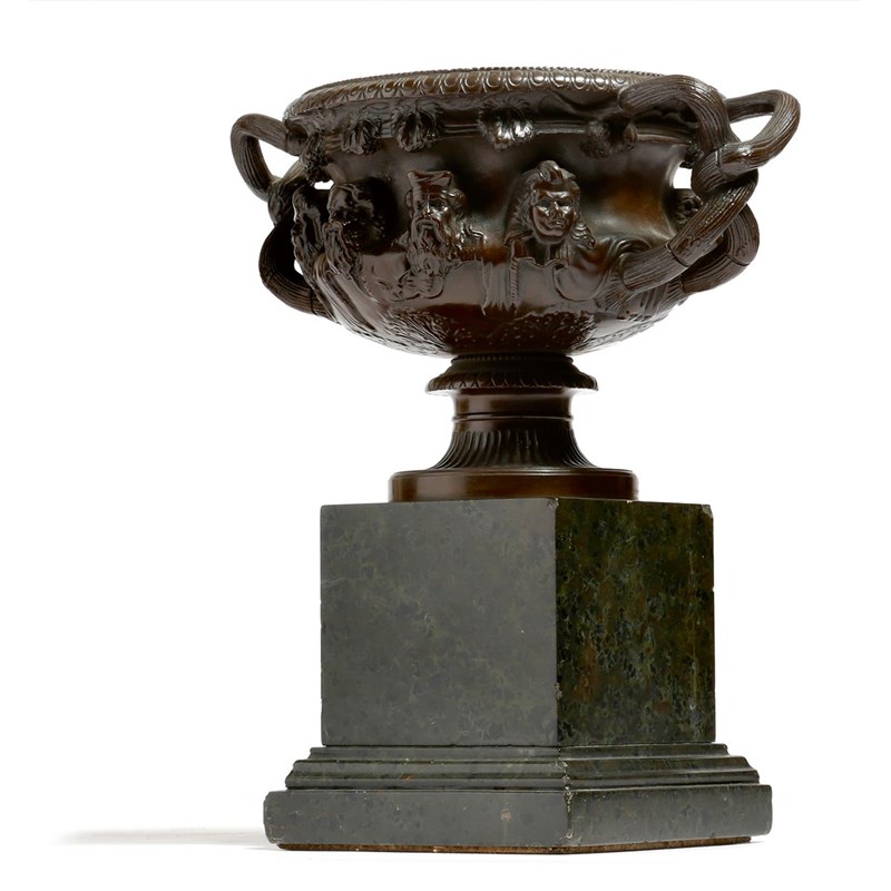 The original marble vase was discovered at the Villa Albani, Rome and in the Barbedienne catalogue of 1886 was titled as 'Cratere vase consacre a Bacchus'.