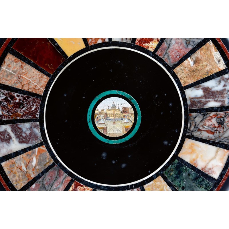 A 19th century Italian Grand tour specimen marble and micromosaic circular plaque, the centre with a view of St. Peter's Square, Rome within a malachite border, the verso with a faint inscription '....Sistina '73...', 28.4cm diameter.