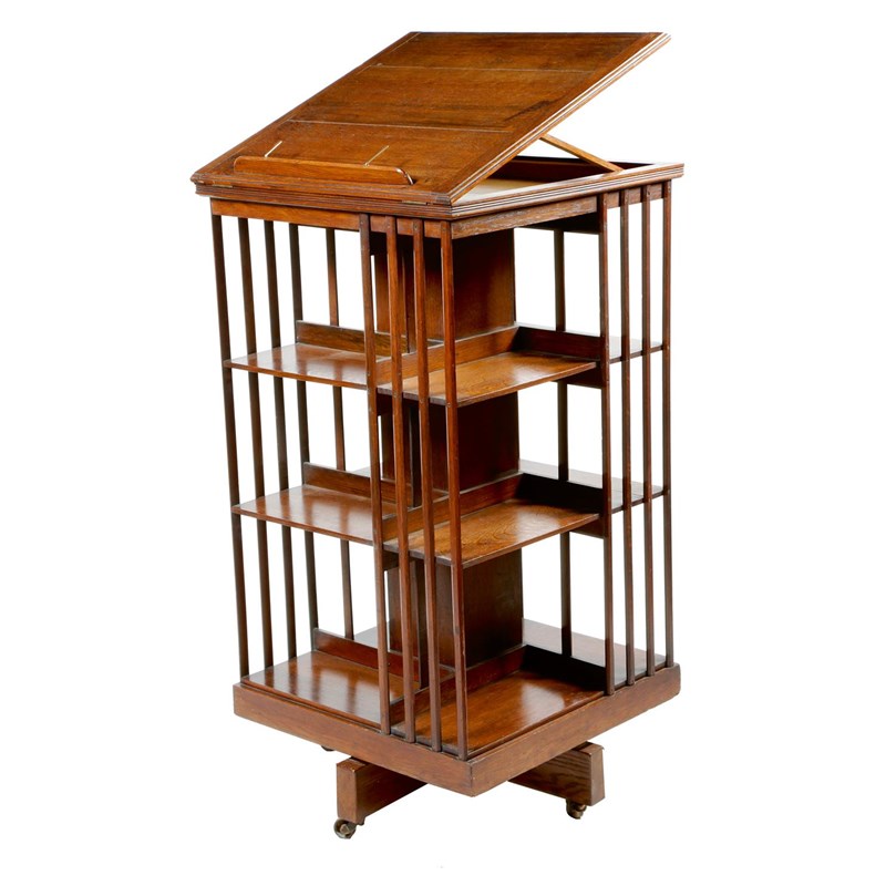 An Edwardian oak revolving bookcase, the hinged top with a ratchet and with a rest, with a metal trade label inscribed 'MATTHEWS & Co., ART FURNISHERS, Gloucester' on brass castors, 114.7cm high, 60.2cm square.
