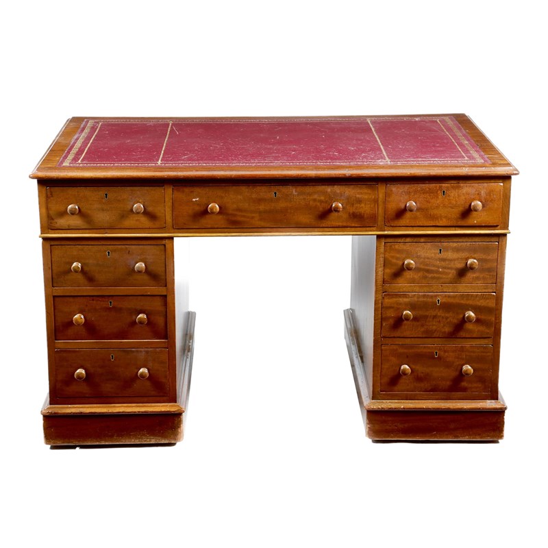 A Victorian mahogany twin pedestal desk, the top with a moulded edge and inset with a later gilt tooled maroon leather, with an arrangment of nine drawers, the central frieze drawer stamped 'JAMES WINTER & SONS, 101 WARDOUR ST., SOHO, LONDON', on castors, 75.3cm high, 121.2cm wide, 76.7cm deep.
