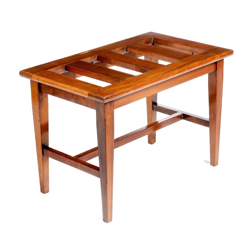 A late Victorian walnut luggage rack, the slatted top above stretchered supports, the underside with stencilled numbers, 46.1cm high, 66.5cm wide, 40.5cm deep.