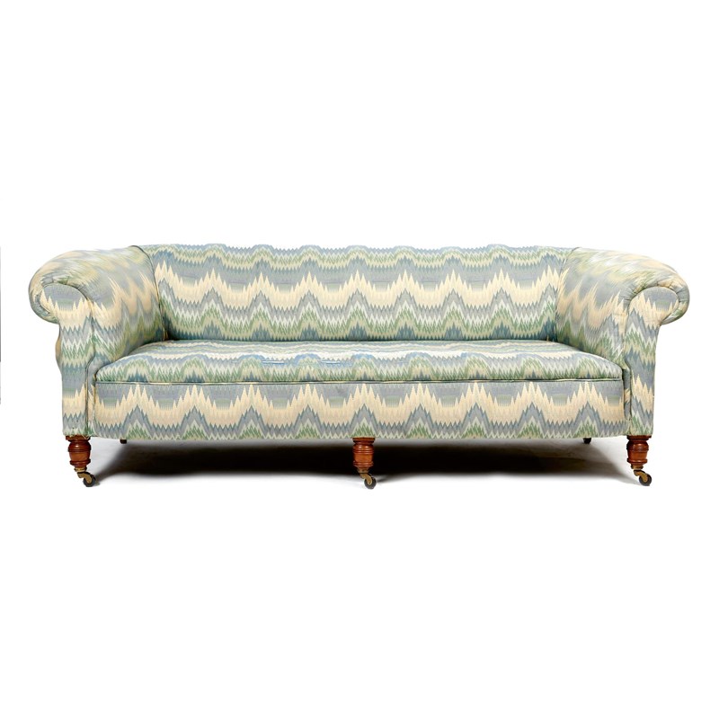 A late Victorian walnut Chesterfield sofa, upholstered with Bargello style fabric, on ring turned front legs and on ceramic castors, 74.6cm high, 208.5cm wide, 83cm deep.