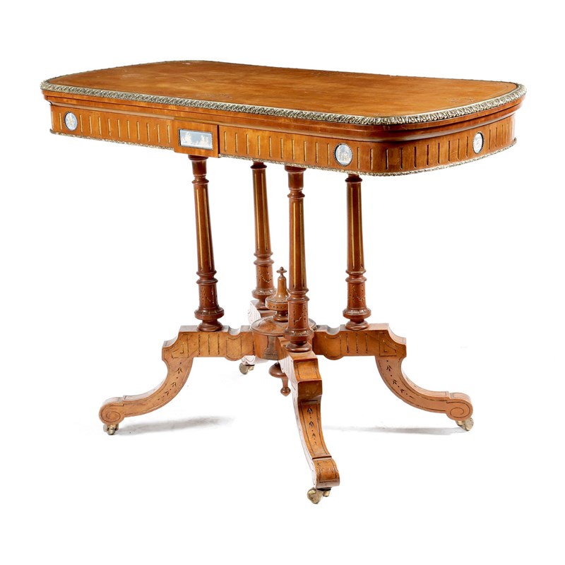 A Victorian satin birch card table, with brass mounts and parcel gilt engraved decoration, the hinged swivel and fold-over top revealing a blue baize playing surface, with a gilt tooled leather border, the fluted frieze decorated with blue and white jasper ware plaques, on four column supports and brass castors, 71.1cm high, 95cm wide, 47cm deep.