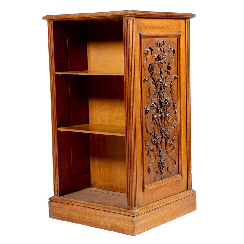 A Victorian oak double sided pedestal open bookcase, one end with a decorative panel, with applied carvings of scrolling leaves, flowers and a quiver of arrows, with four adjustable shelves, some numbered, 100.5cm high, 55.5cm wide, 55.5cm deep.