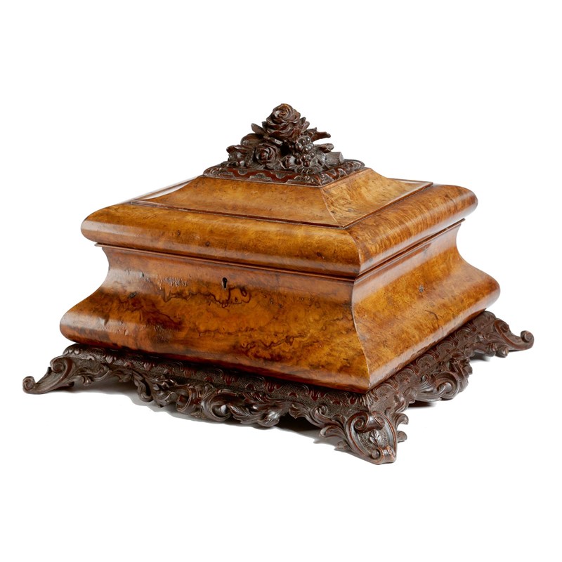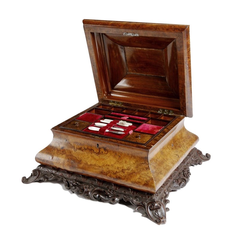 A Victorian walnut sarcophagus sewing box, with burr veneers, the hinged lid carved with flowers, acorns and leaves, revealing a lift-out tray with divisions and compartments and with mother of pearl handled utensils, 32.7cm high, 45cm wide, 40.5cm deep.