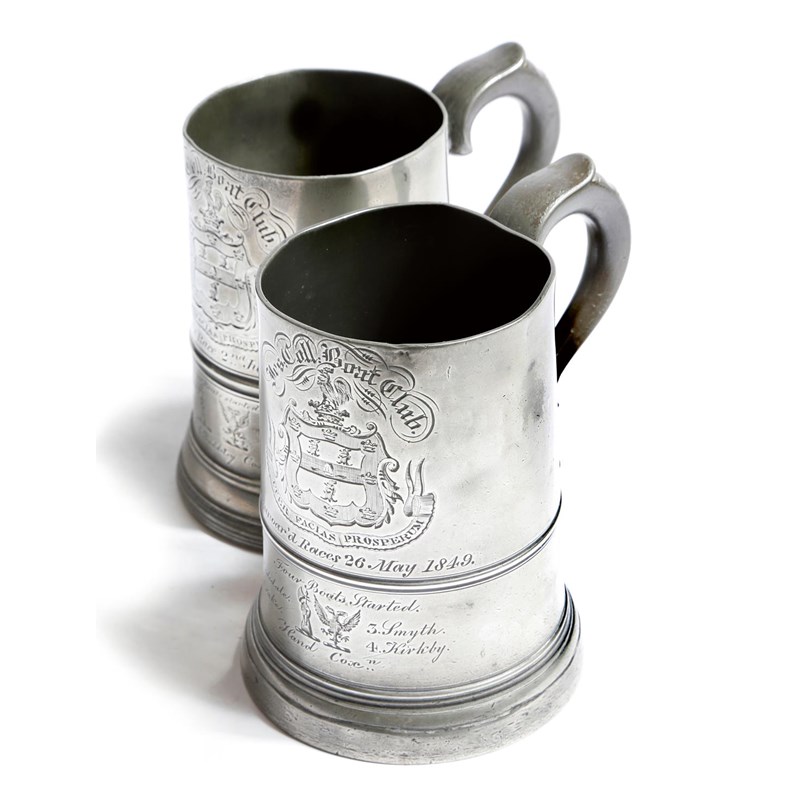 Rowing interest. Two early Victorian pewter Jesus College Cambridge mug / trophies, each inscribed 'Jes. Coll. Boat Club' with the college coat of arms and motto, 'Four-oar'd Race' '2nd June 1848' and '26 May 1849', with the names of the oarsmen and cox, each with a glass base, 16.3cm high. (2)