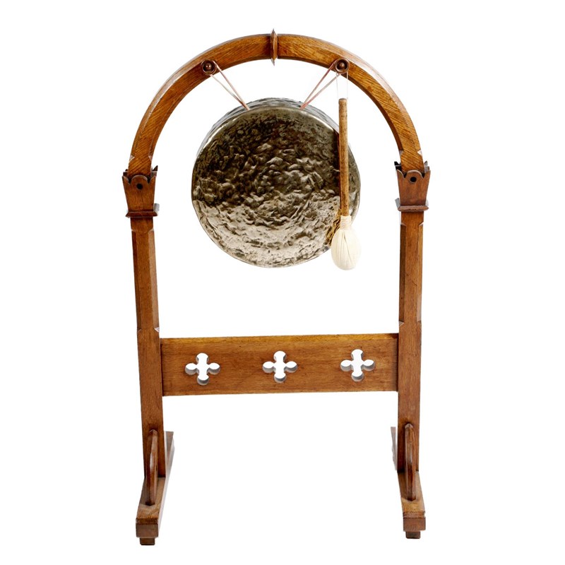 A Victorian oak Gothic style gong, with beater, 92.7cm high, 54.8cm wide, 34.3cm deep. (2)