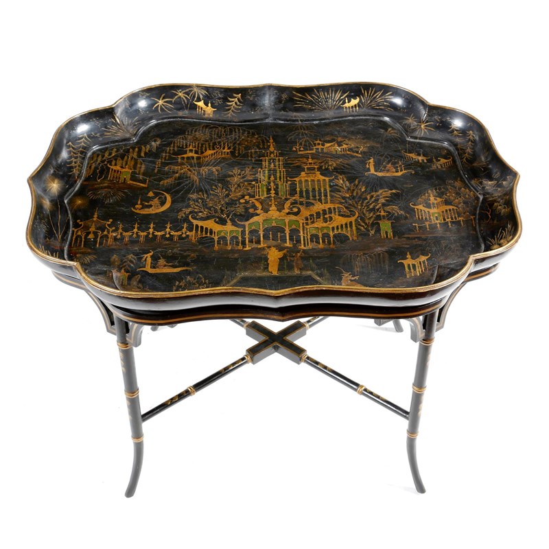 A William IV papier-mâché tray, of serpentine outline, decorated with gilt with chinoiserie scenes, including figures, pagodas, weeping willows and lanterns, on a later stand, 53.2cm high, 80cm wide, 61.3cm deep.