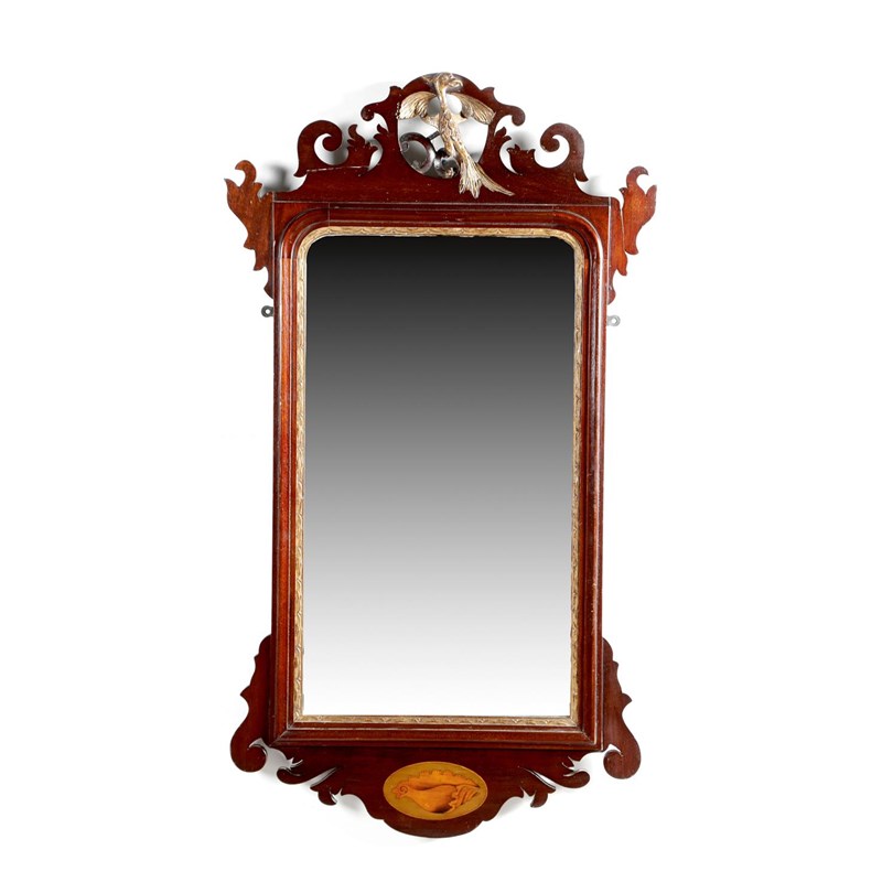 A George II style mahogany fret-frame mirror, the bevelled plate within a gilt slip, with a gilt ho-ho bird surmount and inlaid with a marquetry conch shell, late 19th century, 91.7 x 51.4cm.