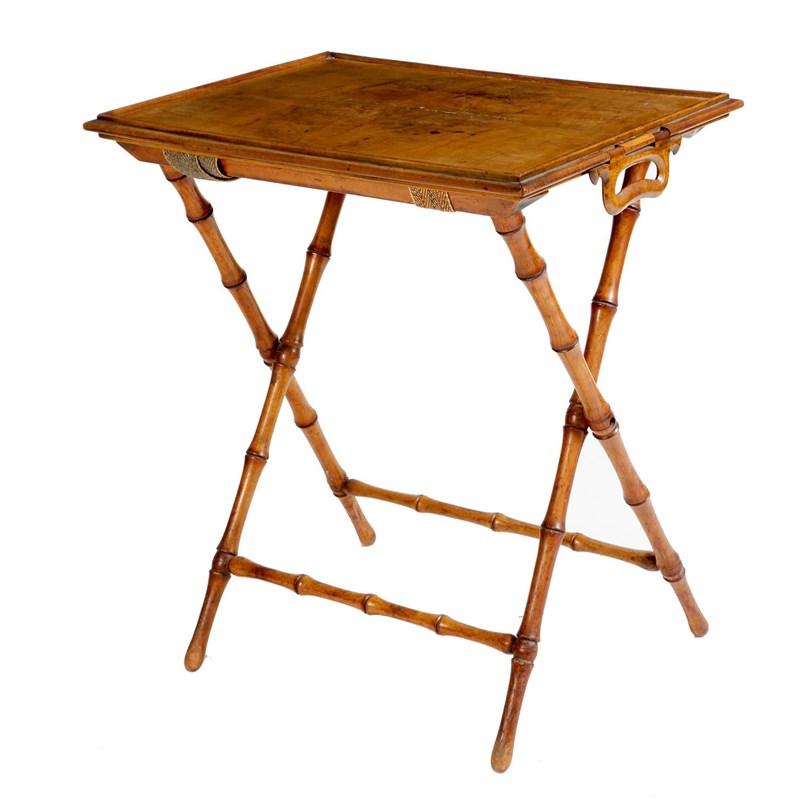 A late Victorian olivewood butler's tray, with a quarter veneered top and a pair of swing handles, on a faux bamboo folding base, 75.5cm high, 61.7cm wide,46.5cm deep.