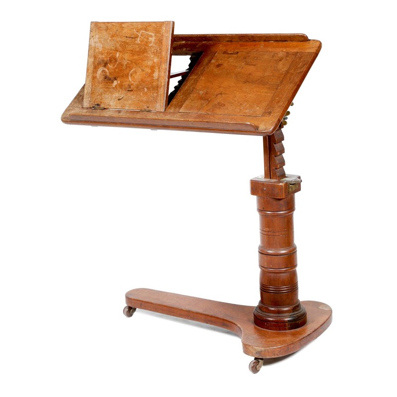 A late Victorian walnut reading table by Leveson & Sons, with an adjustable slope and a ratcheted bookrest, with an applied ivorine plaque inscribed 'LEVESON & SONS, 90 NEW OXFORD ST. W. C. & 21, PARK SIDE, KNIGHTSBRIDGE, LONDON & MANCHESTER, LIVERPOOL, LEEDS', on ceramic castors, 117.8cm high (max), 79.5cm wide, 42cm deep.