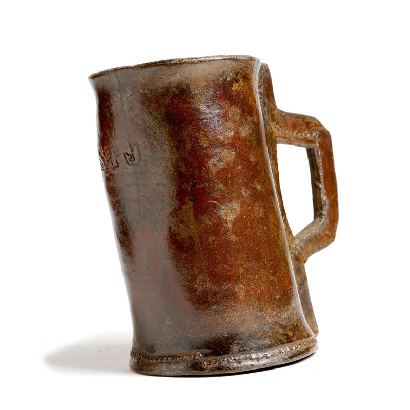 An 18th century leather mug or blackjack, stamped with initials 'S T J', 17cm high.